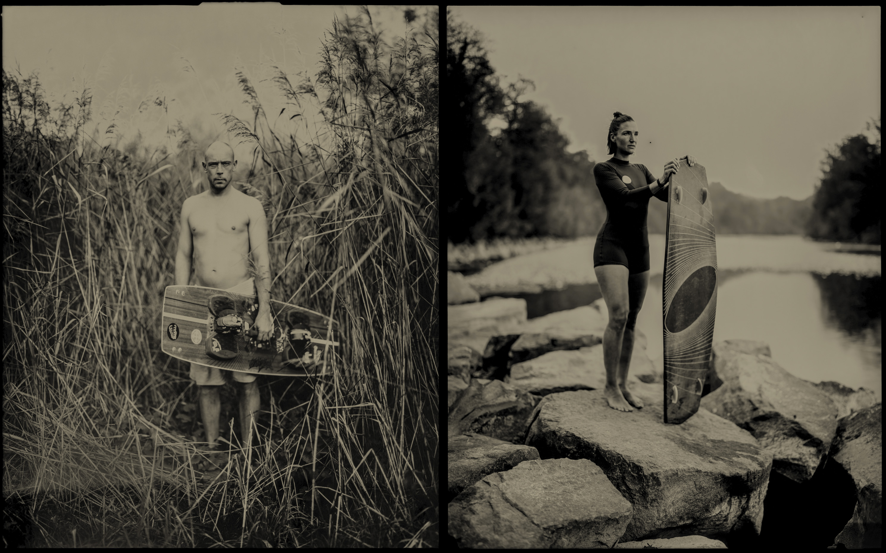Fotograf Stefan Wermuth porträtiert mit seiner analogen Grossformatkamera aus Mahagony und Messing, der legendären Deardorff 8x10, Flusswellenreiter und Bungee-Surferinnen auf Dry Plate Tintypes (Ferrotypien). Ein fotografisches Direktpositiv-Verfahren aus dem 19. Jahrhundert. Beliebt auf Jahrmärkten und bei Wanderfotografen.