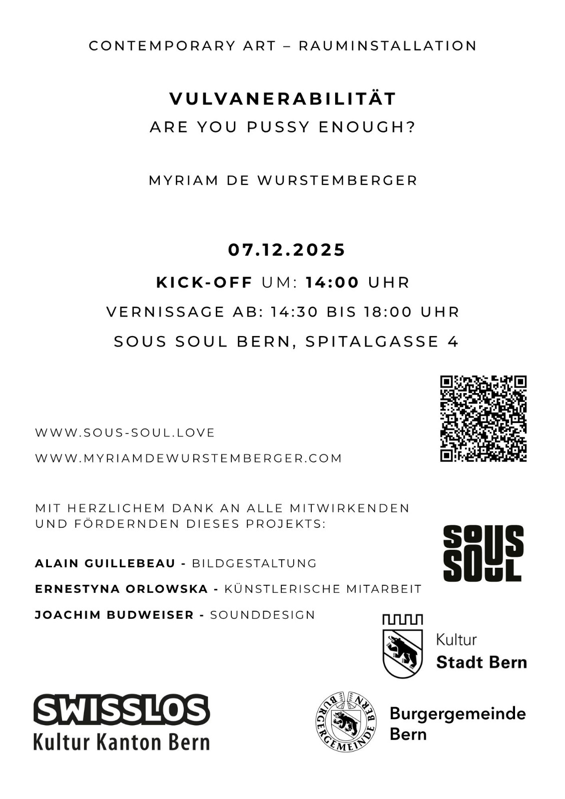 In Vulvanerabilität– Are You Pussy Enough? präsentiert die Künstlerin Myriam de Wurstemberger Objekte,die berühren und berührt werden wollen. Mit feinem Humor und einem Sinn für Ästhetik hinterfragt sie gesellschaftliche Strukturen und macht Themen wie Gewalt, Körper und Schönheit unmittelbar erfahrbar.