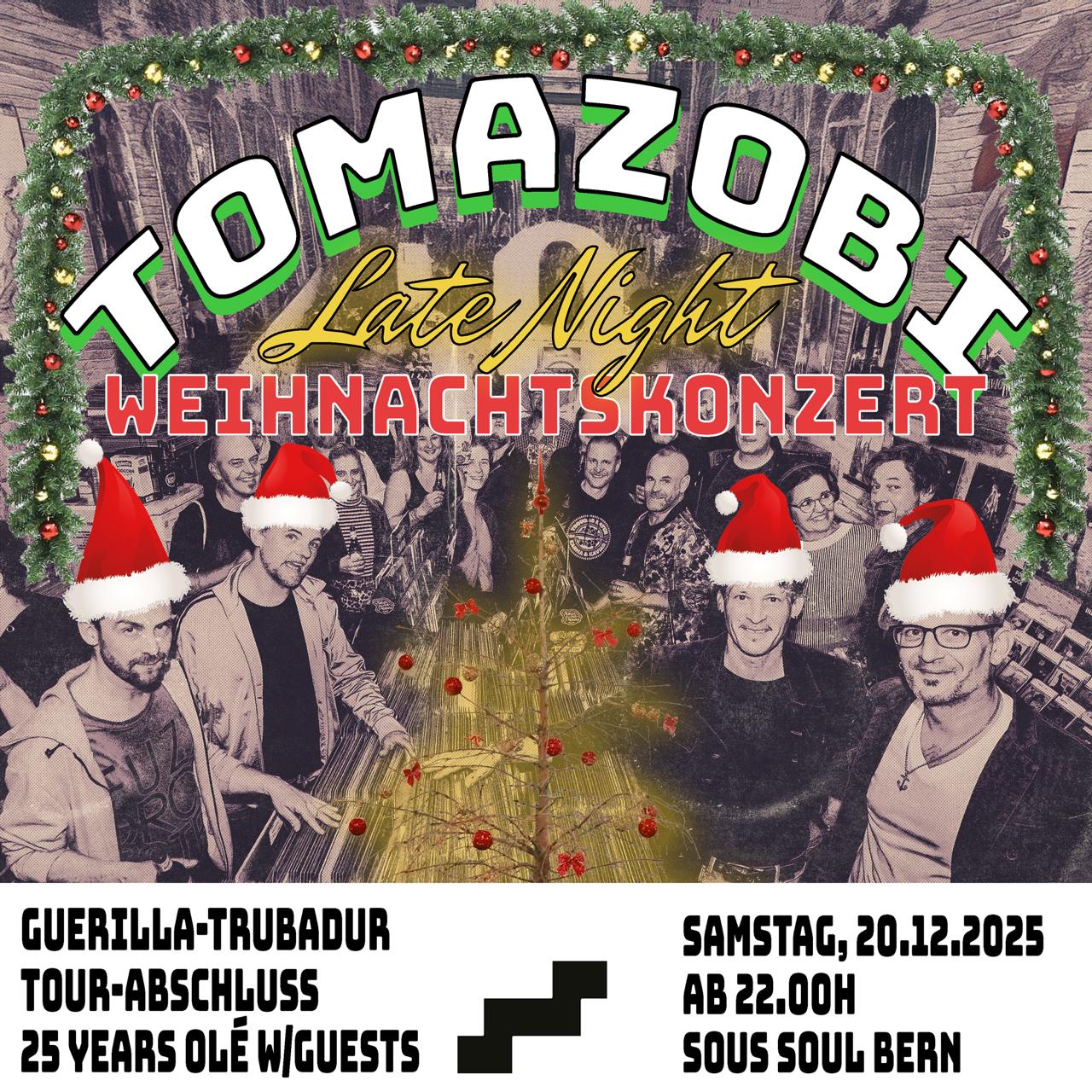 2006 haben Tomazobi im damaligen Sous Soul ihr Live-Album «Grand Prix» aufgenommen. Mit ihrer wilden Mischung aus Troubadour-Chansons, Flamenco-Akrobatik, Harmonie-Gesängen und frechem Mundwerk haben die vier Berner seither in der ganzen Deutschschweiz Heldenstatus erspielt. Zum Vierteljahrhundert-Jubiläum ist die brandneue Best of Platte (limitiert auf Vinyl) erhältlich und die 25-years-olé!-Tour findet im Sous Soul einen rauschenden Abschluss. Mit vielen Gästen und Weihnachtsüberraschungen.